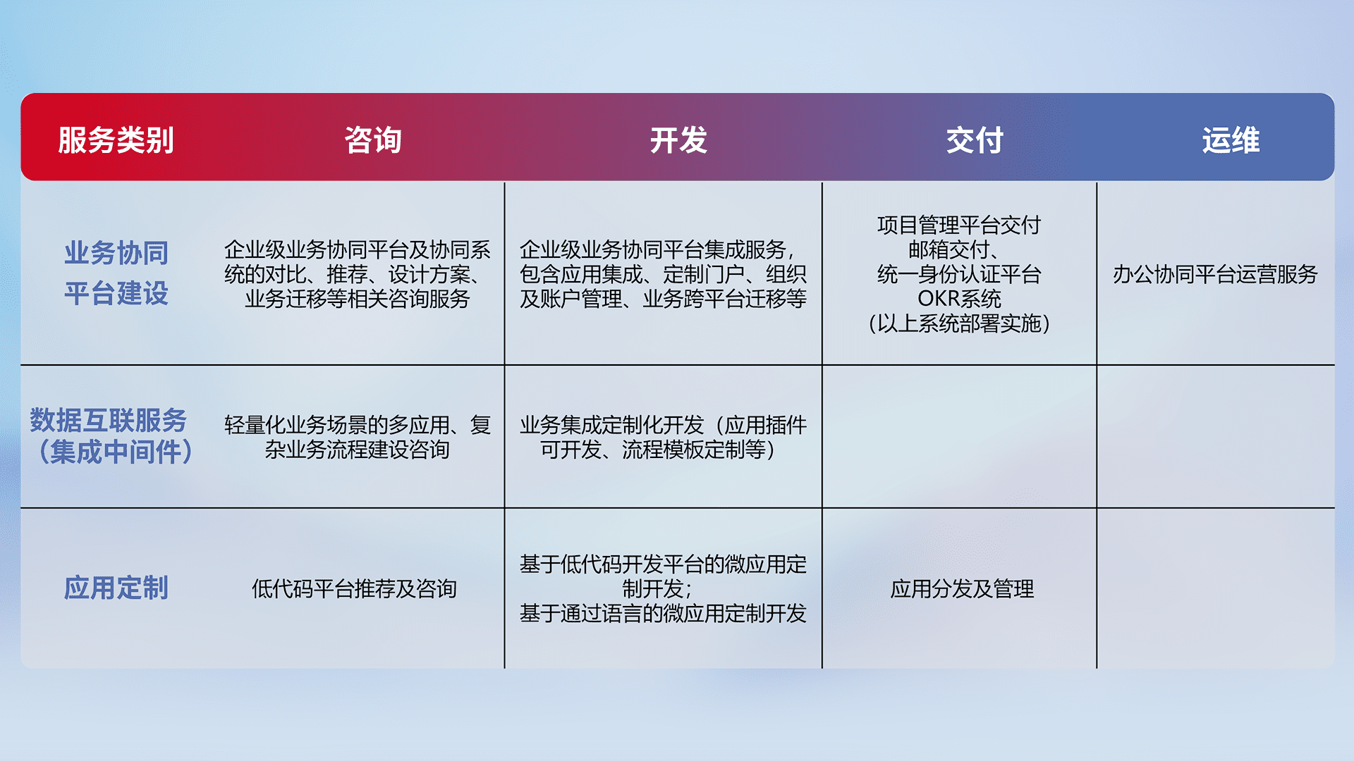 针对钉钉、、、、企微、、、IDaas等平台级产品提供产品的规划、、、、方案、、、交付、、、定制化开发等服务,,,,实现如统一协同办公、、智能客户服务、、、、混合会议管理、、智能数据查询、、等业务场景,,实现数字化转型。。